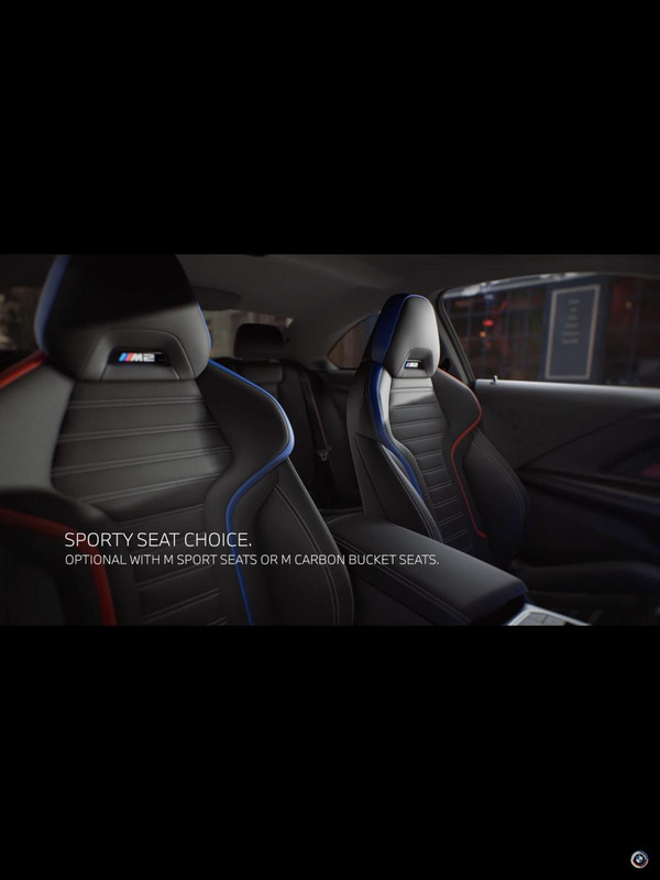"There will be two optional roofs..." Although below from press release seem to suggest sunroof is standard. "There are two roof variants for the new BMW M2: an electrically operated glass slide/tilt moonroof offering a glass surface now larger by nearly 20 percent compared with the outgoing model is standard equipment. A weight-reducing M Carbon roof panel is optional and deletes the moonroof." Last edited by M3WC; 10-12-2022 at 02:34 PM.. |