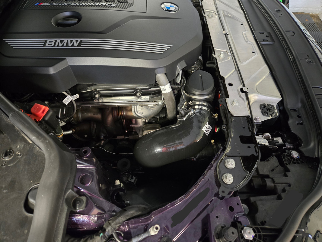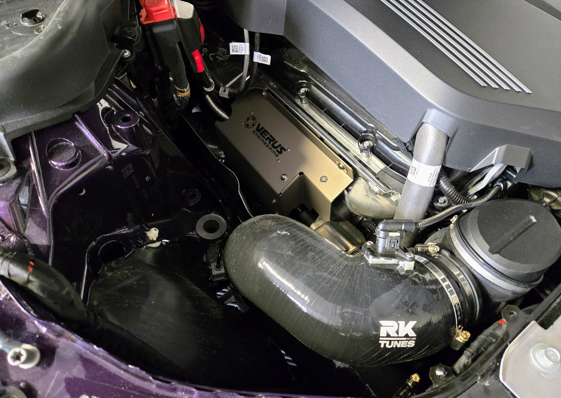 - Remove all the stuff on top of the radiator stack, including the silver cross brace that the Vbrace attaches to. - Remove the active grill shutter motor for easier access to the area - Remove OEM intake and snorkel. To remove the snorkel you have to break it down into its two pieces in place (tricky) - Remove snow guard and trim the plastic/rubber shroud to make room for the intake tube - Pass the 90deg elbow section into the front from the engine bay. Takes quite a bit of squishing and working and elbow grease. - Attach all the pieces including the filter and get the intake fully in place so that you know the filter and front tube are in their final position. - Re attach the silver cross brace without fully tightening the screws then the V brace, fully tightened. - Install the cooling stack cover and squish everything together, its a tight fit. - Reinstall everything you removed. My install took about 2hours but mostly because I was being careful since I had no instructions on what to do. Could probably replace the filter in 45 mins tops. I bought an extra filter to swap in so that I can clean the used one without needing it to re-assemble everything. ![]() ![]() ![]() ![]() Added the Verus Heat Shield which you can read about here: https://www.verus-engineering.com/bl...sting-data-105 ![]() Fabspeed HJS Downpipe Received. ![]() ![]() ![]() ![]()